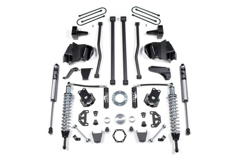 Up front the lift kit includes FOX 2.5 Coil-Over shocks, all four control arms plus mounting bracket, forged drop pitman arm and track bar bracket for steering correction, bump stops, and sway bar links. In the rear this kit utilizes heavy duty cast steel blocks, longer u-bolts, and a matching set of FOX 2.0 Performance shocks.