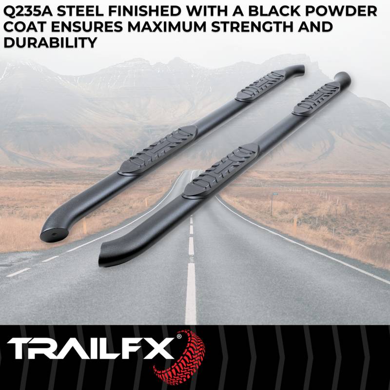 4 Inch Oval Bent Powder Coated Titanium Black Mild Steel Rocker Panel Mount When it comes to your truck or SUV, you want quality, style, protection, and durability at a price you can afford. TrailFX offers you an array of products, whether it is for work or play, TrailFX has something for everyone's needs. Step bars to grille guard Limited 3 Year Warranty Rocker Panel Mount Has A 300 Pounds Capacity 4 Inch Oval Tube Side Steps Provide A Larger Step For Secure Footing, Easy Vehicle Access, And Improved Ground Clearance Slip-resistant Molded Step Pad
