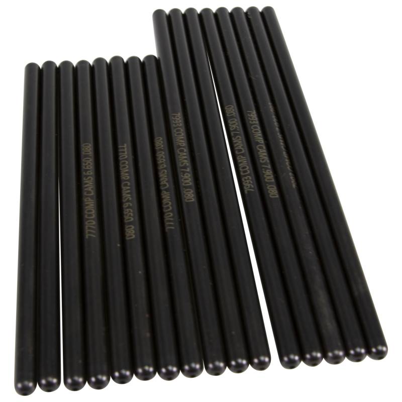 Hi-Tech .080" Wall Pushrod Set for '03-'08 Dodge 5.7L HEMI COMP Cams HEMI pushrod sets are a continuation of the Hi-Tech Pushrod line. These pushrods sets are engineered to provide optimal preload for specific late-model HEMI applications when using performance camshafts. Like all COMP Cams Hi-Tech Pushrods, these are a one-piece construction from .080” wall chromemoly tubing and are cryo-treated for extended durability. In addition, they feature precision formed and reinforced ball type ends, and the whole pushrod is black oxide finished and laser etched. COMP Cams Hi-Tech Pushrod Sets are available for the 2003-08 5.7L, 2005-10 6.1L and 2009-Current 5.7L/6.4L HEMI applications.