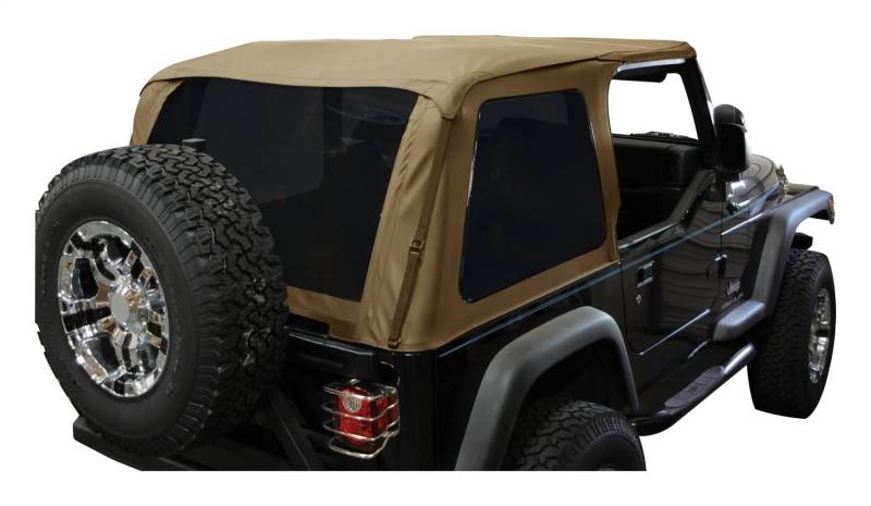 Spice Diamond Bowless Replacement Top w/ Tinted Windows for 97-06 TJ w/o Unltd. RT Off-Roads Bowless Soft Top installs directly over the factory roll bar. It requires no additional supports and still maintains a snug fit. This design allows for larger side windows to improve visibility. When the side and rear windows are removed the top converts into an open air safari top. Each top includes tinted windows and storage pockets. Windbreaker Installs Over Factory Roll Bar Assembly Integrated Interior Storage Pockets