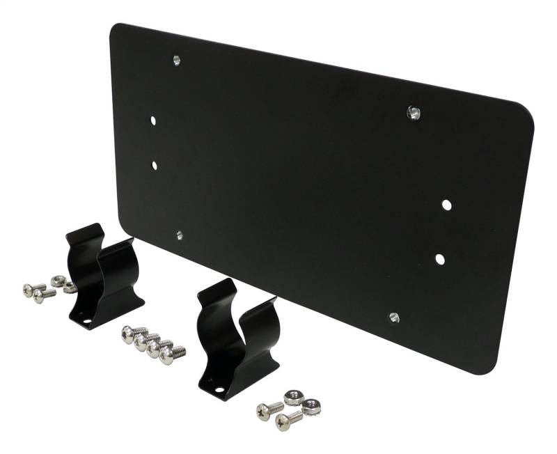 Bumper RT Off-Roads License Plate Bracket is the perfect solution to mounting a license plate to a winch bumper without provisions for a license plate. The bracket snaps onto the winch roller fairlead and allows the use of the winch with a small tug on the bracket. Included is a flat black powder coated bracket, 2 fairlead clips, and hardware. Simple Solution To A Common Problem Keeps Vehicle Legal Where Front Plate Is Required