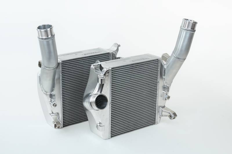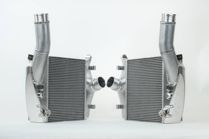 Lamborghini Urus / Audi RS Q8 Twin Intercooler Set - Raw Billet CSF once again has teamed up with leading Southern California VAG specialists, Pacific German from Orange County, CA to design, develop, and test the new intercooler kit on their very own Lamborghini Urus. Sold as a pair (Left & Right Intercoolers) Eliminates Heat Soak and Lower Intake Air Temperatures (IAT) for Maximum Performance in High-Performance and Race Conditions Formula-1 Performance Grade Cores by PWR (2-Row Cores features Rolled Tubes w/ Inner Fins) CNC Machined Billet End Tanks 100% TIG Welded vs OEM Crimped Plastic End Tanks for Maximum Strength & Durability