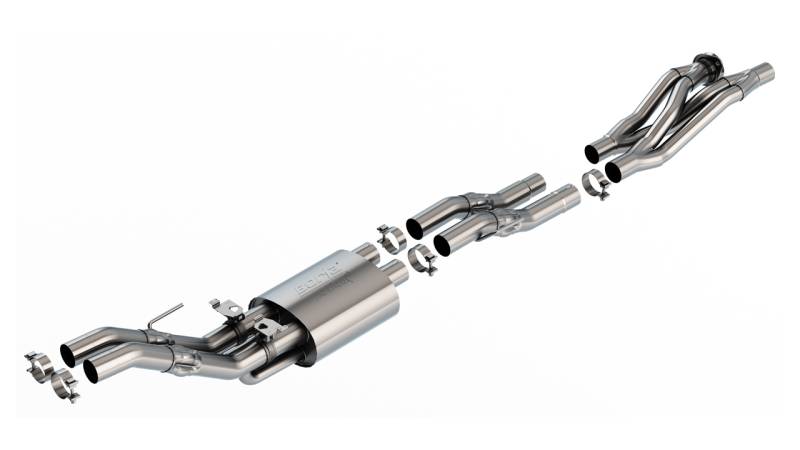 Mid-Section Exhaust System w/ Muffler, X-Pipe & Mid-Pipe - ATAK® Borla(r) system is a True Dual design. This 3" diameter Mid-Section includes Active Exhaust Valves. The ATAK(r) sound level delivers an aggressive, race-bred sound without any drone. It features our Polyphonic Harmonizer and SwitchFire(r) technology. Borla(r)'s Polyphonic Harmonizer Technology utilizes patented units that contain pipes of different diameters and lengths to create multiple exhaust notes that harmonize to deliver a clean, rich, full-bodied sound. Completely eliminating the turbulent center intersection of a standard X-Pipe, Borla(r)'s patented SwitchFire(r) design truly blends the combustion pulses from both sides of the engine for improved performance and a custom sound. It fits with either Borla(r) 60727BC black chrome on T-304 stainless steel, 60727CB brawler style black coated T-304 stainless steel, 60727CFBA carbon fiber with black anodized center, or the Original Equipment (O.E.) tail pipes. The system is constructed using T-304 stainless steel, superior to T-400 series knockoffs (such as 409), to give you the absolute best in performance and durability. Ultra-smooth mandrel bends ensure maximum flow & power, and precision computer numerical control (CNC) manufacturing ensures an accurate fit. Best of all, it is backed by our Million Mile Warranty. System is a True Dual design Contains SwitchFire(r) technology Contains Polyphonic Harmonizer technology Contains Polyphonic Harmonizer technology Contains Active Exhaust Valves