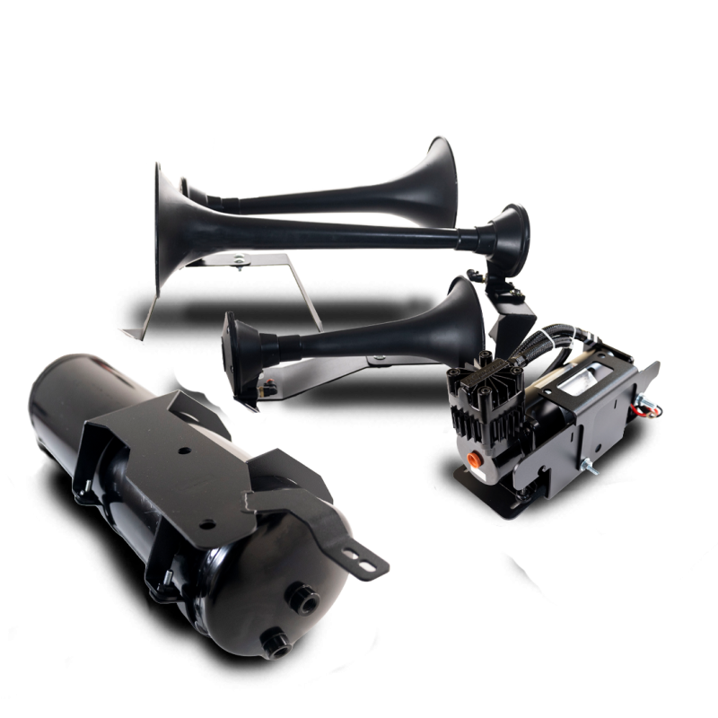 Onboard Air System w/Horns; Includes Triple Black Horns PN[730]/ 150/200 PSI Air Compressor PN[6450RC]/ 2.6 Gallon Air Tank PN[6353RT];