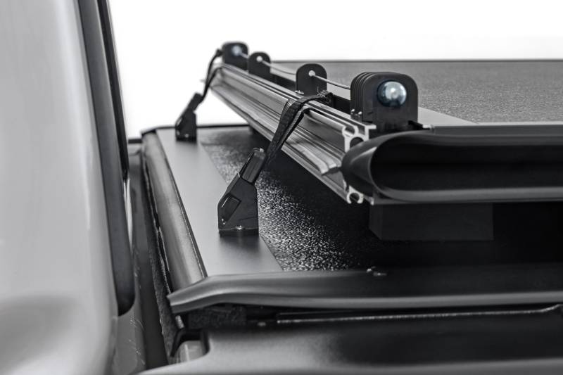 Rough Country's Hard Low-Profile Bed Cover is built for drivers who demand clean styling, real protection, and effortless access. This tri-fold hard tonneau cover sits flush with your bed rails, delivering a sleek, low-profile look while locking down your cargo with rugged aluminum construction. Designed for everyday use and weekend adventures alike, this cover blends durability, security, and convenience into one streamlined upgrade.Ultra Low-Profile Style: Skip the bulky bed covers. This flush-mounted design pairs rigid aluminum panels with a matte black finish for a modern, off-road-ready appearance that complements your truck without compromising bed space.Quick Tri-Fold Access: Need fast access to your cargo? The tri-fold design opens in seconds, allowing you to run fully closed or safely drive in the 2/3 open position using integrated nylon safety straps.Secure, Auto-Latching Protection: An automatic latching system engages when the cover is closed, working in conjunction with your tailgate lock to keep tools, gear, and valuables protected from unwanted access.Built Tough for Any Weather: Heavy-duty aluminum panels and a corrosion-resistant black powder coated frame deliver long-lasting strength, while integrated drain tubes help manage water and keep your bed dry.Simple No-Drill Installation: Designed for an easy bolt-on install, this cover mounts using a secure track and rail system with all hardware and tools included, so you can spend less time installing and more time driving.Confidence-Backed Durability: Backed by Rough Country's 5-Year Warranty, this hard low-profile tonneau cover is built to perform and engineered to last.Upgrade your truck with a bed cover that delivers sleek styling, dependable security, and effortless functionality. Rough Country's Hard Low-Profile Bed Cover is the perfect finishing touch for drivers who refuse to compromise.