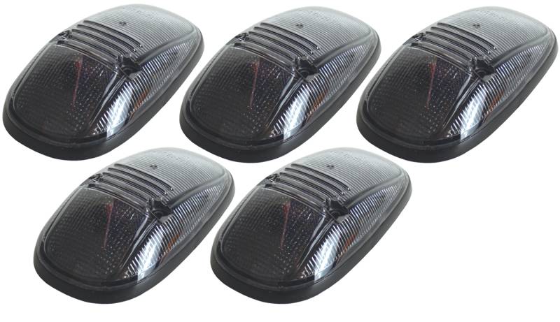 Smoke Hi-5 Cab Roof Light Kit, 99-02 Dodge Style Styled after the popular 1999-2002 Dodge Ram heavy duty pickup, these high quality cab roof lights include modern smoked lenses but illuminate in amber to give the "big rig" look to light duty trucks and sport utility vehicles and provide a better visual fix to drivers in other vehicles. Their unique base design adapts and seals to flat or curved roof surfaces. Sold in a 5 light kit and include all necessary mounting hardware, wiring and a manual switch. Ultra Bright Light
