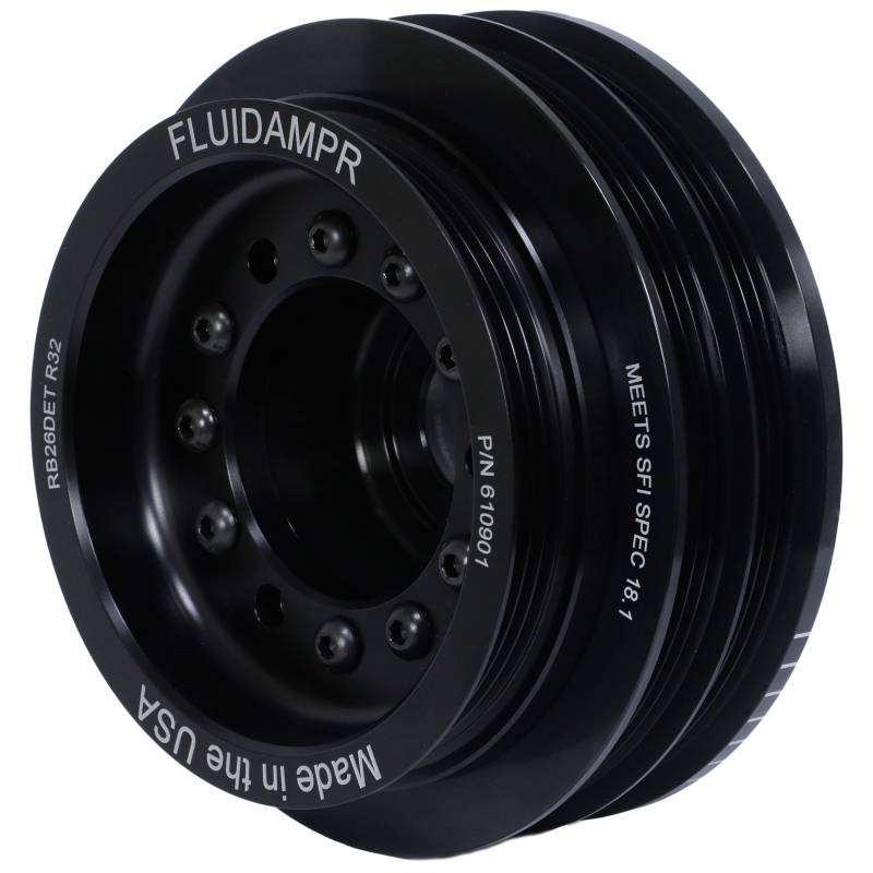 Harmonic Balancer - Fluidampr - Nissan Skyline R32 GTR -1989-1994 RB26DET phase1 Protect your engine. Modifications can compromise your stock harmonic balancer. Install a Fluidampr performance damper early for best durability. Superior viscous damper design controls harmful torsional vibration across the entire rpm range. Reduce wear on engine components. Reduce risk of crankshaft failure. Improve timing. Unleash lost torque and horsepower. Precision CNC machined and balanced high-grade steel components. Corrosion resistant black zinc finish with engraved timing marks. No maintenance required. Trusted by leading engine builders worldwide. SFI 18.1 certified. Made in USA. Broad RPM range protection. Reduce risk of crankshaft failure. Reduce wear on critical engine parts. Unleash lost torque & horsepower. No maintenance required.