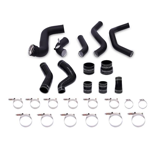 Intercooler Kit, Black/Black, fits Ford F-150 EcoBoost 2011-2014 Cool down those charge air temperatures with the Mishimoto direct-fit performance intercooler and pipe kit for the 2011-2014 Ford F-150 EcoBoost. The small, factory intercooler sits in the bottom part of a spacious and unconventionally shaped cavity behind the front bumper, which means There's a lot of wasted space there that could be used for cooling improvements. That?s why the Mishimoto intercooler has been cleverly engineered with a unique angled design to take full advantage of the space for maximum performance. This intercooler boasts an 88-percent increase in core size, 66-percent increase in internal core volume, and 40-percent increase in external fin surface area. The Mishimoto intercooler lowers intake temperatures by 50?F (28?C) compared to the factory part. But of course, no intercooler is complete without a set of pipes to complement it. This kit also includes Mishimoto 2011?2014 F?150 EcoBoost Intercooler Pipes which are an ideal upgrade in reliability and performance. Accompanied by silicone couplers with DuraCore? technology, Mishimoto's F?150 EcoBoost intercooler piping is engineered to eliminate restrictive bends while improving durability and airflow. Compared to normal silicone, DuraCore? provides superior resistance to heat, pressure, fuel, and oil. These pipes alone have been dyno proven to provide your truck with up to 15 more horsepower and 21 Ft/lbs more torque.Of course, this kit is backed by our Mishimoto Lifetime Warranty, so you never need to worry about buying another intercooler and pipe kit again. 50F (28C) reduction in AIT 88-percent increase in core size 66-percent increase in internal core volume and 40-percent increase in external fin surface area