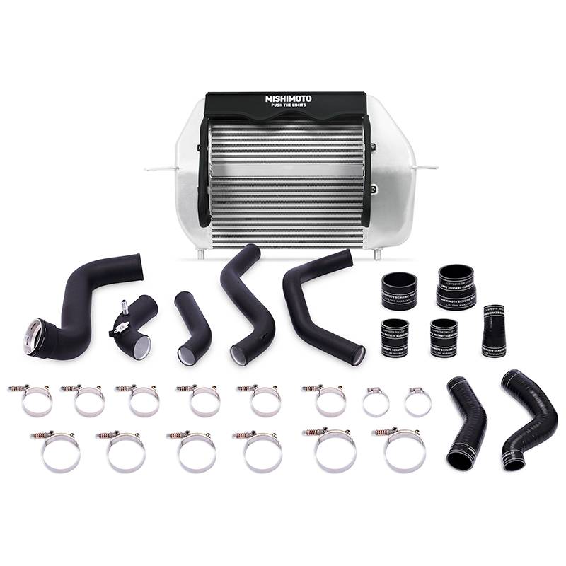 Intercooler Kit, Silver/Black, fits Ford F-150 EcoBoost 2011-2014 Cool down those charge air temperatures with the Mishimoto direct-fit performance intercooler and pipe kit for the 2011-2014 Ford F-150 EcoBoost. The small, factory intercooler sits in the bottom part of a spacious and unconventionally shaped cavity behind the front bumper, which means There's a lot of wasted space there that could be used for cooling improvements. That?s why the Mishimoto intercooler has been cleverly engineered with a unique angled design to take full advantage of the space for maximum performance. This intercooler boasts an 88-percent increase in core size, 66-percent increase in internal core volume, and 40-percent increase in external fin surface area. The Mishimoto intercooler lowers intake temperatures by 50?F (28?C) compared to the factory part. But of course, no intercooler is complete without a set of pipes to complement it. This kit also includes Mishimoto 2011?2014 F?150 EcoBoost Intercooler Pipes which are an ideal upgrade in reliability and performance. Accompanied by silicone couplers with DuraCore? technology, Mishimoto's F?150 EcoBoost intercooler piping is engineered to eliminate restrictive bends while improving durability and airflow. Compared to normal silicone, DuraCore? provides superior resistance to heat, pressure, fuel, and oil. These pipes alone have been dyno proven to provide your truck with up to 15 more horsepower and 21 Ft/lbs more torque.Of course, this kit is backed by our Mishimoto Lifetime Warranty, so you never need to worry about buying another intercooler and pipe kit again. 50F (28C) reduction in AIT 88-percent increase in core size 66-percent increase in internal core volume and 40-percent increase in external fin surface area