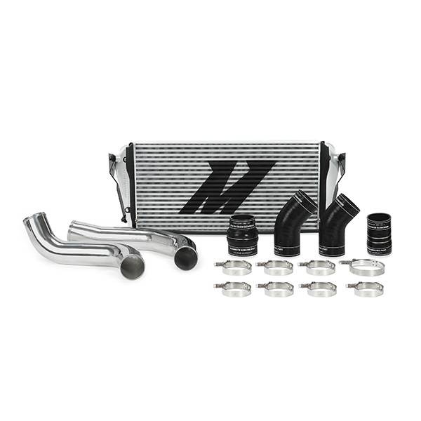 Intercooler Kit, Silver/Polished, fits Dodge 6.7L Cummins 2013-2018 Mishimoto has released a performance intercooler kit for the 2013-2018 Dodge 6.7L Cummins. This kit includes everything you need to improve airflow, substantially decrease charge-air temperatures and support your truck at any power level. The first key component is the Mishimoto 6.7L Cummins intercooler piping kit. Our engineers have maximized airflow by eliminating restrictive bends, allowing for smooth and unimpeded airflow. The piping is constructed of mandrel-bent 3in aluminum for smooth flow and rugged durability. Also included are Mishimoto silicone boots with DuraCore technology and Mishimoto Constant-Tension T-Bolt Clamps for accurate and consistent holding force. Mishimoto DuraCore technology comprises the innermost layer of all Mishimoto diesel silicone boots. Compared to normal silicone, DuraCore provides superior resistance to heat, pressure, fuel, and oil. This effectively increases the life of your boots and prevents leaks or blowouts. This package also includes the Mishimoto 6.7L Cummins intercooler. Extremely durable cast aluminum end tanks and a bar-and-plate core provide cool, dense air to your engine, with the reliability you need. With a 76.65-percent increase in external fin surface area, and a 37.8-percent larger core, this intercooler is proven to reduce intake air temps by 12.5-percent. All the components in this kit are engineered to last, just like your truck. Offered with either a Sleek Silver or Stealth Black core, the Mishimoto 6.7L Cummins intercooler kit, like all our Dodge Ram performance parts, is protected by the Mishimoto Lifetime Warranty. Whether your Cummins is stock or modified, trust Mishimoto and our line of Dodge Ram performance parts to keep your Dodge cool. Includes hot-side and cold-side intercooler pipes and boots Lowers AITs by 12.5-percent 3-in mandrel-bent polished aluminum piping