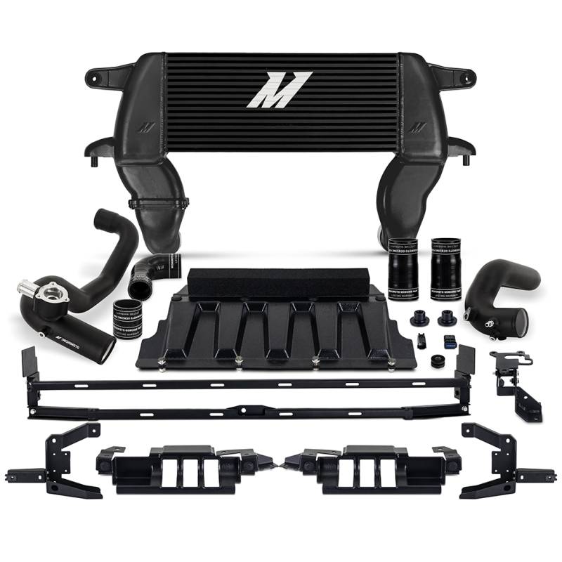 High-mount Intercooler Kit, 2021+ Ford Bronco 2.3L, Black Core, Black Pipes Unleash your 2021+ 2.3L EcoBoost Ford Bronco’s full potential with the Mishimoto High-Mount Intercooler Kit! Designed to allow your Bronco to breathe the coldest, densest air possible, this high-mount intercooler kit is comprised of our high-mount intercooler and performance intercooler pipe kit.----We’ve relocated the intercooler to the upper grille to allow better airflow at all times, even with winches, light bars, or larger bumpers installed. This location also helps protect the intercooler from obstacles on the trail. Our intercooler utilizes a 3.1 inch-thick bar-and-plate core that’s precision TIG welded to cast aluminum end tanks for superior durability and heat soak resistance. The weak plastic stock piping is replaced with high-flowing, durable aluminum piping and silicone boots with DuraCore technology. The larger volume of our pipes allows your 2.3L EcoBoost to breathe freely and make the most of its turbo, while the all-aluminum construction and DuraCore boots provide unmatched durability.----Durability is always a good thing, but it's even better when it's paired with performance. The high-mount intercooler boasts a 49-percent greater core volume and 93-percent greater external fin surface area than stock, which results in 21-degree cooler outlet temps over the stock intercooler. We also saw exceptional improvement in our trail simulation heat-soak testing where, after 6 back-to-back dyno runs, we still saw outlet temperatures 20-degrees cooler than stock.----This intercooler kit is available with a stealth black or sleek silver intercooler and micro-wrinkle black powder coated or polished pipes to match any style. Functionality of adaptive cruise control is retained utilizing a relocation bracket and 360-degrees cameras are unaffected. As with all our products, the Mishimoto 2021+ Ford Bronco 2.3L High-Mount Intercooler kit is backed by our signature Mishimoto Lifetime Warranty and comes with all necessary hardware for easy installation. Relocates intercooler for better airflow with winches, lights, and other off-road accessories Dyno-proven max gains of 4.5 hp and 10.8 lb-ft torque Includes adaptive cruise control relocation mount and does not interfere with 360-degree cameras