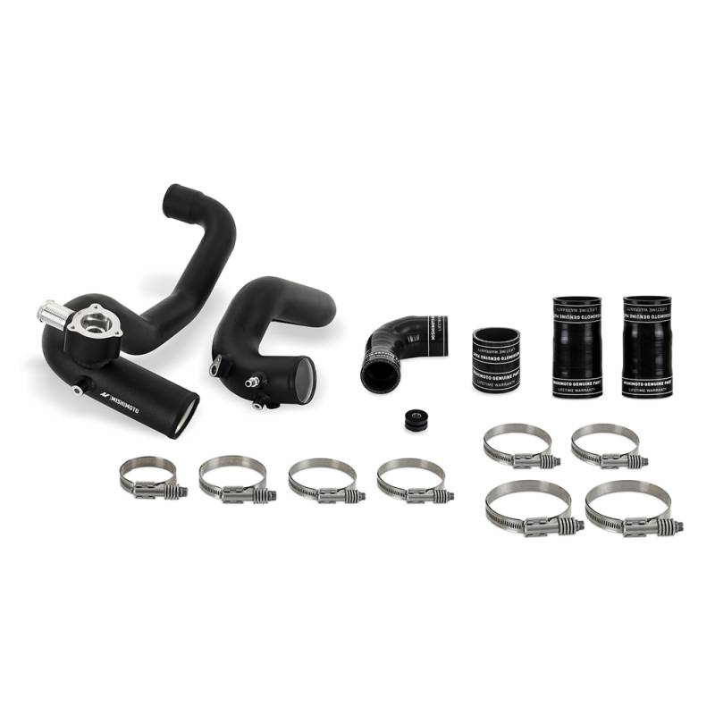 Intercooler Pipe Kit, Black, High-Mount, fits Ford Bronco 2.3L EcoBoost 2021+ Mishimoto has developed a direct-fit intercooler pipe upgrade kit for the 2021+ Ford Bronco 2.3L EcoBoost that allows you to maximize the performance potential of your 2.3L Bronco. This pipe kit is specifically designed for customers who have previously purchased the Mishimoto performance high-mount intercooler and would like to couple it with the Mishimoto pipe kit. This kit includes all the components you will need to upgrade your setup to the full Mishimoto charge air system.---- Our kit replaces the weak and unattractive plastic piping with high-flowing, durable aluminum piping and silicone boots with DuraCore technology. The Mishimoto intercooler pipes flow up to 61-percent better than the stock pipes, allowing your 2.3L EcoBoost to breathe freely and make the most of its turbo. When combined with our high-mount intercooler, the charge air system produces power gains of 4.5 HP and 10.8 lb.-ft of torque. DuraCore boots coupled with constant-tension worm gear clamps provide superior strength and blowout resistance, ensuring boost always makes it to its destination. Available with a sleek polished finish or powder-coated in stealthy wrinkle black, these pipes are a great addition to every 2.3L Bronco from daily driving to the office, to trailblazing through the woods. The included upgrade couplers provide unrestricted flow from the pipes to the intercooler, maximizing flow and performance.----As with all Mishimoto products, this 2021+ Ford Bronco 2.3L EcoBoost intercooler pipe kit is backed by our Mishimoto Lifetime Warranty. Up to 60-percent less restrictive than stock pipes Dyno-proven power gains of 4.5 HP and 10.8 lb-ft. of torque on stock tune Includes DuraCore boots for optimal flow between high-mount intercooler and pipes