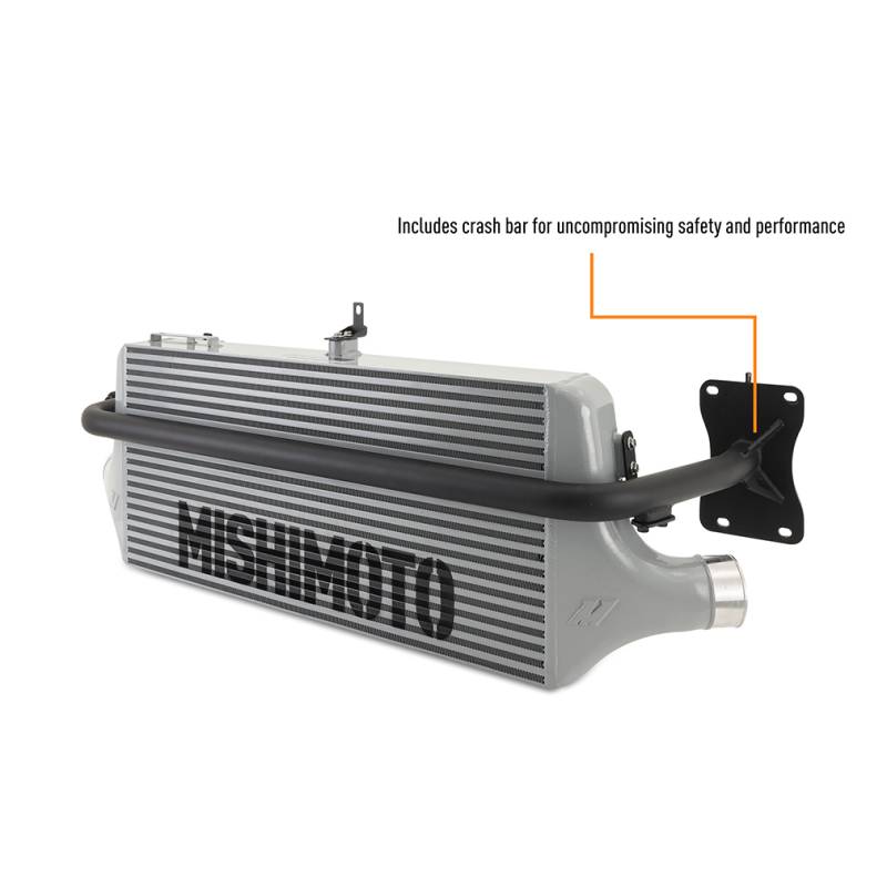 Front Mount Intercooler Kit w/ Intake, fits Subaru WRX 2022+ For 2022+ WRX owners looking to take the next step in performance, look no further than Mishimoto's Performance Front-Mount Intercooler Kit. Whether you're building your WRX for the track, dragstrip, or the road, upgrading your WRX's intercooler is an absolute must. Designed with a massive core, CFD-optimized cast end tanks, and high-flow pipes, this intercooler offers gains of 12 hp and 11.8 lb-ft torque.----The front mounting location of this kit places the intercooler in the lower bumper grille for maximum airflow through the core, making this system ideal for high-performance builds. In dyno testing, our intercooler was able to bring outlet temperatures to within 10-degrees of ambient air temp, ensuring safe power run after run, even on the stock tune. CFD-optimized end tanks, ID-matched pipes, and a high-flow, 4 inch-thick core result in a 1.5 PSI pressure drop, so less of the boost your turbo makes is wasted. This kit includes our Mishimoto Performance intake for maximum airflow and an easy install.----Performance is great, but if you have to destroy your car for it, it's useless. Our kit contains everything needed for installation with no cutting of the bumper or body required. Our intercooler kit also retains the factory side impact bars and includes a bumper support bar with factory tow hook mounting for safety on the track and the street. The included washer fill neck relocation kit keeps maintenance easy, while allowing for a clean install.----So, If you're ready to ditch your stock, heat-soak-prone intercooler, it's time to upgrade to the Mishimoto Performance Front Mount Intercooler Kit. Designed for dependable performance and backed by Mishimoto's Lifetime Warranty, our 2022+ WRX front mount intercooler kit is the perfect choice for bringing your WRX to the next level. Fits 2022+ Subaru WRX Max power gains of 12 HP and 11.8 lb-ft. of torque on stock tune Lowers outlet temperatures to within 10-degrees of ambient air temp
