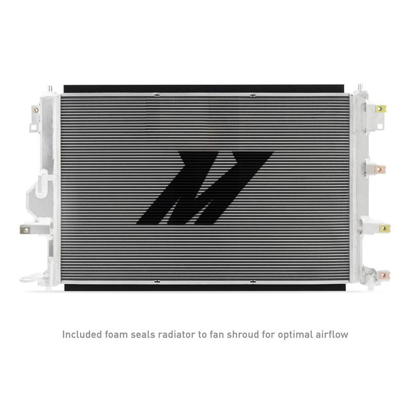 Performance Aluminum Radiator, Fits Toyota GR Corolla 2023+ The 2023+ Toyota GR Corolla churns out 300 horsepower from just 3 cylinders and 1.6L of displacement. Each cylinder is running at the limit, and your GRC's cooling system has a lot of work to do to keep up. Long battles on the track or sitting in traffic can easily overwhelm the stock cooling system, and some owners have seen oil temps over 260 degrees on track. The stock oil cooler on the GRC is a liquid-to-liquid design that relies on coolant temperatures to maintain safe oil temps. If your radiator can't keep up, it's only a matter of time before your oil can't either. That's why Mishimoto has developed a performance aluminum radiator to keep every aspect of your GR Corolla's engine cool.----This all-aluminum radiator replaces the stock plastic end tank unit with a core that is 51 percent larger. That increase in core volume means your cooling system can hold more coolant and dissipate more heat, placing less stress on the cooling system overall. Inside the core, we've focused on utilizing the entire cooling area with strutted tubes and louvered fins. Strutted tubes allow us to use a single, wider tube, that has greater effective area than multi-row cores. These strutted tubes also significantly improve core rigidity to help prevent leaks from impacts like potholes or running off track. Louvered external fins circulate air throughout the core to transfer more heat. Finally, the included foam shrouding ensures cool air goes through the core, not just around it.----In addition to performance, we've also thought about durability and serviceability. Our radiator features reinforced intercooler mounts, so you can add a larger intercooler (like Mishimoto's) without worrying about the mounts breaking. To help service your new radiator, we've designed an extended drain port with a slotted drain plug, to keep draining mess-free. Of course, this 2023+ GR Corolla performance radiator is also backed by our Mishimoto Lifetime Warranty for a lifetime of performance. 51 percent increase in core volume over stock for improved cooling performance Single-row core with strutted tubes utilizes entire core thickness for cooling Louvered external fins improve heat transfer