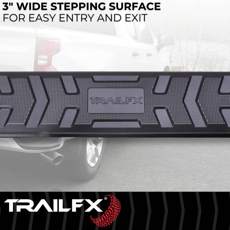Rocker Panel Mount TrailFX A4 Series is constructed from weatherproof hexagonal extruded aluminum combined with unique styling and performance. A4 series steps include brackets with plastic covers, custom step pads and titanium black powder coat finish long lasting durability. Made With Corrosion Resistant Extruded Aluminum 4.5 Inch Hexagon Shape For Unique Styling Light Textured Black Powder Coat Finish 3 Inch Wide Step Area Provides Moderate Protection Against Road Hazards And Debris