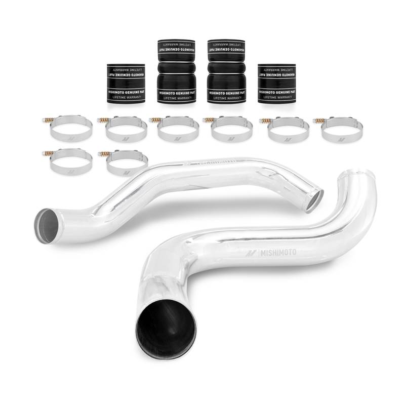 Ford 7.3L Powerstroke Intercooler Pipe and Boot Kit, 1999-2003 Give your Ford Super Duty the durability boost it deserves with the Mishimoto Intercooler Pipe and Boot Kit for the 1999-2003 Ford F-Series 7.3L Powerstroke. These workhorse turbodiesels produce mounds of boost pressure to churn out the serious torque that you need. This abuse takes its toll on the intercooling system, especially the piping. The Mishimoto pipe and boot kit replaces the stock system with a pair of tough, mandrel-bent aluminum pipes for both the intercooler's hot and cold sides for maximum durability. This kit includes Mishimoto Silicone Boots with DuraCore technology. Mishimoto DuraCore technology is the synthetic material that comprises the innermost layer of all Mishimoto Silicone Diesel Boots. Compared to normal silicone, DuraCore provides superior resistance to heat, pressure, fuel, and oil. This effectively increases the life of our boots by preventing leaks and blowouts. The kit includes Mishimoto Constant-Tension T-bolt Clamps for accurate and consistent holding power to add even more reliability. For the best performance, make sure to pair this kit with our Mishimoto Ford 7.3l Powerstroke Performance Intercooler. The Mishimoto Intercooler Pipe and Boot kit for the Ford F-Series 7.3L Powerstroke is available in a polished and wrinkle-black powder-coated finish and includes the Mishimoto Lifetime Warranty for a worry-free installation. Mandrel-bent polished aluminum pipes for maximum durability Includes Mishimoto Silicone Boots with DuraCore Technology and Mishimoto Constant Tension T-bolt Clamps Installs in under one hour