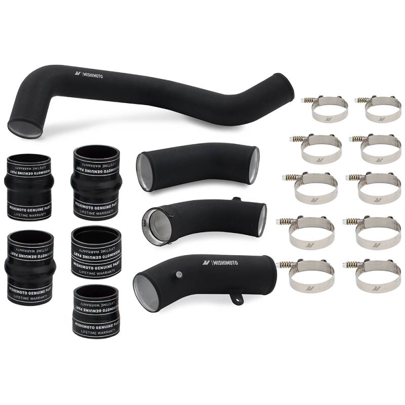 Intercooler Pipe Kit, Black, fits Chevrolet/GMC 6.6L Duramax 2017-2019 Improve the power and efficiency of your 2017-2019 Chevrolet/GMC 6.6L Duramax L5P with our Mishimoto intercooler pipe and boot kit. The factory L5P intercooler pipes are a measly 2.5in diameter that chokes the engine, while tight bends and a resonator on the hot side create even more restriction.The Mishimoto intercooler pipes are 3in in diameter throughout with smooth transitions to significantly increase airflow, resulting in more power potential. Our hot-side pipe also eliminates the stock resonator for maximum flow. Combined, the Mishimoto intercooler pipes are up to 55-percent less restrictive than stock.Both the hot-side and cold-side utilize a two-piece design for ease of install. To connect the pipes to our Duramax, this kit also includes our silicone boots with DuraCore™ technology. Mishimoto DuraCore™ technology is the synthetic material that comprises the innermost layer of all Mishimoto silicone diesel boots. Compared to normal silicone, DuraCore™ provides superior resistance to heat, pressure, fuel, and oil. This effectively increases the life of our boots by preventing leaks and blowouts.To add even more reliability, this kit includes Mishimoto constant-tension T-bolt clamps for accurate and consistent holding power. Our cold-side intercooler pipes also feature a CNC-machined quick-disconnect fitting with new O-ring and spring clip to ensure a secure and leak-free fit. Unlike other available pipes on the market, our pipes retain the intake air temp harness mounting location for safe and secure wire routing, just as Chevy/GMC intended. Our intercooler pipes also incorporate two bungs that can be drilled and tapped for sensors, so you can easily monitor your L5P's performance.The Mishimoto 2017-2019 Chevrolet/GMC 6.6L Duramax L5P intercooler pipe and boot kit is a direct bolt-on upgrade and is available in a polished or wrinkle black powder coated finish. Like all our Duramax products, this kit includes our Mishimoto Lifetime Warranty. 3.0-in mandrel-bent aluminum polished pipes eliminate restrictive bends Up to 55-percent less restrictive than stock piping Includes new quick-disconnect O-ring and spring clip