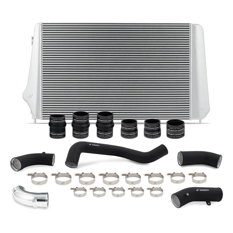 Intercooler Kit, Silver/Black, fits Chevrolet/GMC 6.6L Duramax L5P 2017-2019 Built to handle heavy payloads, provide impressive performance, and execute years of reliable service, the 2017-2019 6.6L Duramax L5P is an absolute workhorse. However, as with any factory vehicle, some systems have limitations and areas that can be improved. Our engineering team has specifically identified the L5P's intercooler system as one of these areas. As a result, we've developed a performance intercooler kit for the 2017-2019 Chevrolet/GMC 6.6L Duramax L5P.This kit includes a massive 68mm-thick bar-and-plate intercooler with cast-aluminum end tanks and 3.0in mandrel-bent piping for maximum cooling and flow. Our intercooler is 70-percent thicker than stock and is designed to be a robust unit capable of withstanding high temperatures and boost pressures without cracking. In addition, our end tanks also feature larger inlets and outlets for even more flow. That, coupled with the larger intercooler core, reduces restriction by over 64-percent compared to the stock intercooler.Our kit also includes hot-side and cold-side intercooler piping with DuraCore™ boots and constant-tension T-bolt clamps. Our 3.0in mandrel-bent aluminum piping eliminates the restrictive stock resonator and improves flow by up to 55-percent over stock. The Mishimoto L5P Duramax intercooler pipes fit like stock thanks to the included CNC-machined quick-disconnect fitting with new O-rings and spring clip, bead-rolled pipe ends, and mounting locations for factory sensors and harnesses. Our pipes also include three bungs that can be drilled and tapped for sensors or water/meth injection.The Mishimoto 6.6L Duramax L5P Performance Intercooler Kit is a direct fit for your 2017-2019 Chevrolet or GMC HD truck and is a fantastic upgrade for both stock and heavily modified trucks. Like all our Duramax performance parts, this L5P intercooler kit is protected by our signature Mishimoto Lifetime Warranty. Includes performance intercooler, hot and cold-side intercooler pipes, and DuraCore boots Reduces restriction by up to 64-percent over stock intercooler system 68mm-thick bar-and-plate core is 70-percent thicker than stock for maximum cooling
