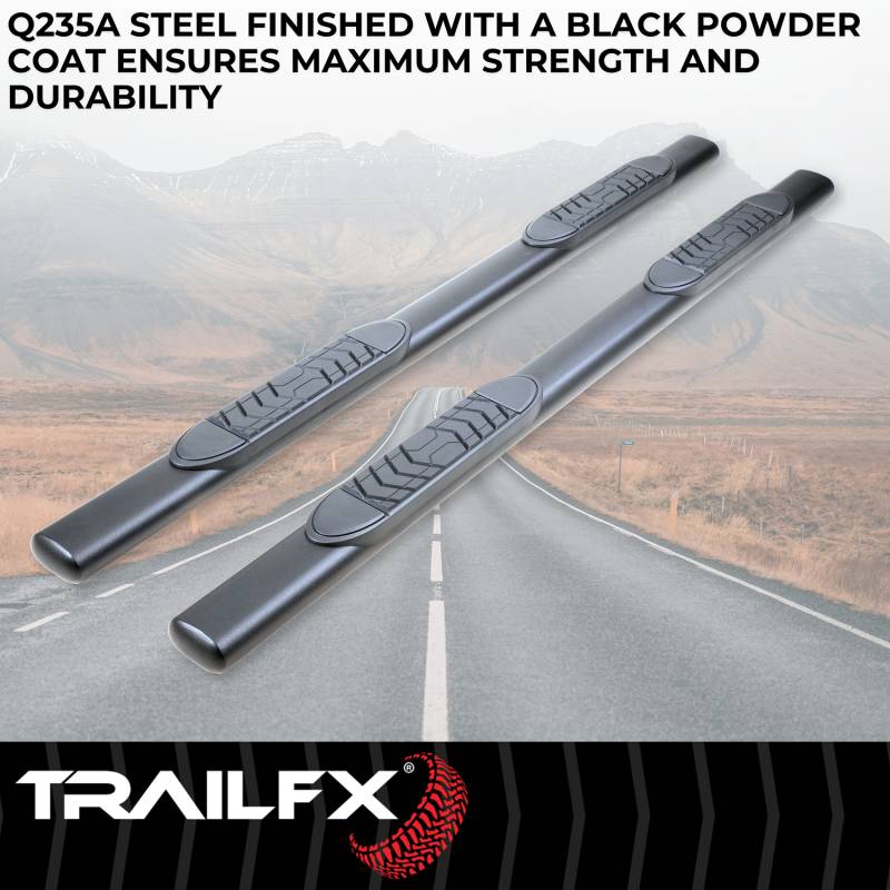 Rocker Panel Mount TrailFX Step Bars maximize style and safety when entering and exiting your vehicle. Available in various sizes, shapes, and finishes, TrailFX steps offer a solution for every need. Each pair installs seamlessly against the vehicle's contours for a sleek and stylish look. With TrailFX step products, a custom look doesn't have to break the bank. Q235A Steel Finished With A Black Powder Coat Ensures Maximum Strength And Durability Extra-Large Molded Step Pads Provide Slip-Resistant Entry Points To The Cab Welded End Caps Add A Clean, Finished Appearance While Keeping The Elements Out Steel Mounting Brackets Are Included To Install Steps With Ease Oval Step Shape Offers A Wider Stepping Area For Secure Footing