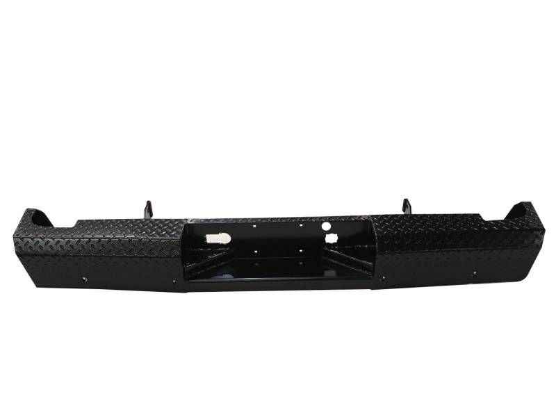 Gloss black powder coated steel construction. Direct fit, one piece design TrailFX Full replacement bumpers are designed for full size trucks with full time jobs. Constructed of heavy duty diamond plate steel with e-coating and and a gloss black powder coated finish, these bumpers can wit'stand the rigors of the road or the range while providing complete and secure protection for your truck. The precision engineered design attaches easily to factory mounting points with supplied hardware and wiring harness. OE sensors remain fully operational. Brackets and Center Step Area are supported by 1/4" thick Steel while the corners are protected by 1/8" steel. Cutouts for OE senors preserve enable the sensors to still function when the bumper is installed Precision welded design compliments body lines for complete and reliable protection E-coated and powdercoated finish provides the maximum protection against rust and corosion