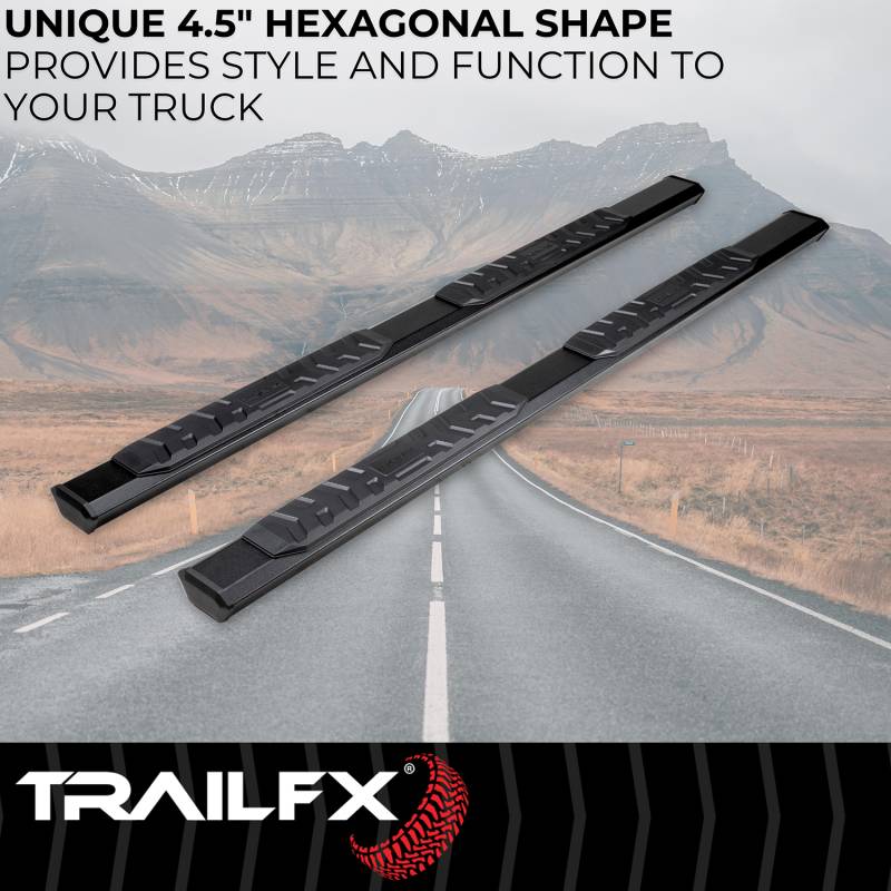 Rocker Panel Mount TrailFX A4 Series is constructed from weatherproof hexagonal extruded aluminum combined with unique styling and performance. A4 series steps include brackets with plastic covers, custom step pads and titanium black powder coat finish long lasting durability. Made with corrosion resistant extruded aluminum 4.5 Inch hexagon shape for unique styling Mounting bracket covers for protection and OE look Light textured black powder coat finish 3 Inch wide step area