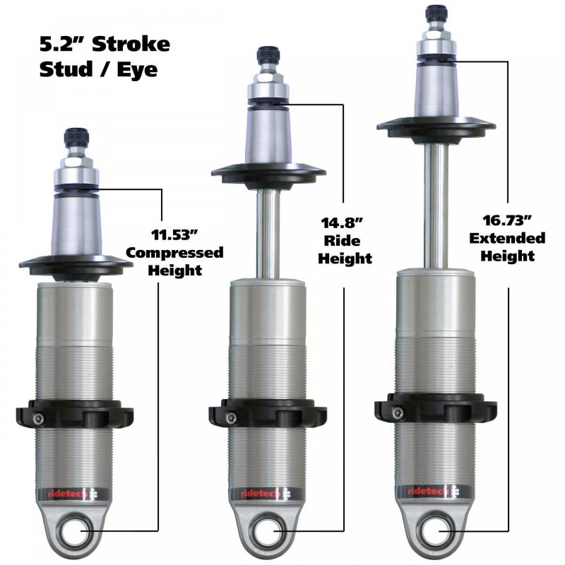 HQ Coil-Over Shock W/ 5.2 Inch Stroke And 2 Inch Stud Mount Universal 1 Rebound Adjustable Shockspring Mounts Delrin Spring Washers And Bearing Spacers 1/2 Inch And 5/8 Inch 11.55 Inch X 16.7 Inch W/ A 14 -14.75 Inch Ride Height Ridetech