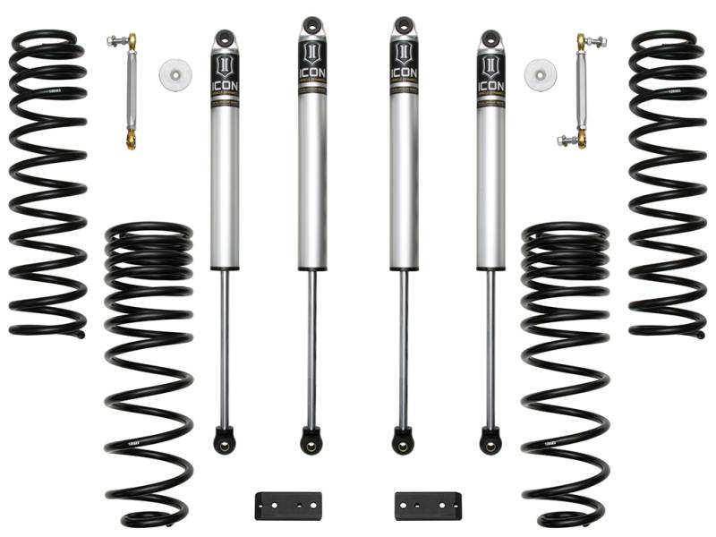 20-UP GLADIATOR 2.5" STAGE 2 SUSPENSION SYSTEM Aimed at drastically improving (not just maintaining) on and off-road ride quality the ICON Jeep Gladiator JT Stage 2 system includes front dual rate coil springs, rear triple rate coil springs, 2.0 Aluminum Series shocks, front bump stops, adjustable sway bar end links, and all necessary hardware for a complete install. The rear triple-rate coil design provides a softer droop and ride rates with a firmer overload rate that combine to deliver on-road comfort with excellent bottoming resistance and superior off-road performance while also lifting the rear of the Gladiator 1.5” over stock. The JT is a very capable vehicle off of the showroom floor and with the addition of an ICON suspension system this capability is only expanded upon with improved suspension geometry and more robust components resulting in significant performance gains. 2.5" lift height Fits 35" tires (37" with extended bump stop spacer kit) 33% front, 23% rear increase in wheel travel Improves on and off-road ride quality over stock Dual rate coil springs with lifetime guarantee against sagging/breakage