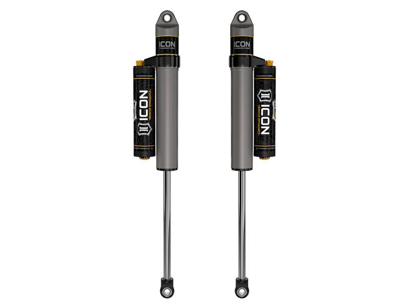 20-23 JT 1.5" REAR 2.5 VS PB CDCV PAIR ICON Vehicle Specific (V.S.) 2.5 Aluminum Series shocks are designed and built to give your vehicle outstanding performance off-road and a smooth ride on the street. These shocks are configured specifically for each application in both length and damping tune. Like all ICON'S Shock Absorbers, V.S. 2.5 Aluminum Series shocks are 100% rebuildable and 100% revalveable. For piggyback and specific remote reservoir applications, ICON'S unique use of a 6061 billet aluminum manifold a few inches below the top cap of the shock creates an internal Bump Zone that when used creates an additional 20% of damping force. This additional force helps prevent harsh bottom outs and controls the suspension when compressing at high velocity. The ICON CDC Valve is an externally adjustable valve that restricts oil flow into the reservoir which creates 10 levels of compression damping force ranges. Shin guards are also included with this application to help protect the shock shafts from debris strikes during off-road use. ICON's CDC Valve technology allows for 10 levels of high-resolution compression adjustability with the turn of a knob One-piece impact extruded aluminum cylinders offer excellent corrosion resistance and consistent finish Protective shin guards standard with every shock 100% Rebuildable 100% Revalveable