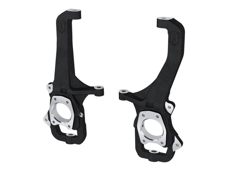 22-24 TUNDRA FRONT SKID PLATE The ICON Vehicle Dynamics Front Steering Knuckle Kit is an essential component of the ICON 6” Lift Performance Suspension System for the 2022-2024 Toyota Tundra, featuring a 4” drop to compliment the ICON high-clearance front crossmembers. Their single piece, high-strength CNC machined ductile iron construction ensures strength and have been engineered to wit'stand the stresses of aggressive off-road use while minimizing un-sprung weight and maintaining factory track width. Optimized steering arm geometry also virtually eliminates bump steer through the entire wheel travel range for predictable handling characteristics. These steering knuckles will stand the test of time with replaceable steering stops, a durable black powder coat finish, and ICON’s Limited Lifetime Warranty. Single piece high-strength ductile iron steering knuckles with built-in 4" drop Precision CNC machined Designed to fit 37" tires with full articulation (larger tires may fit but fender trimming and modifications will be required) Optimized suspension geometry nearly eliminates bump steer Maintains factory track width