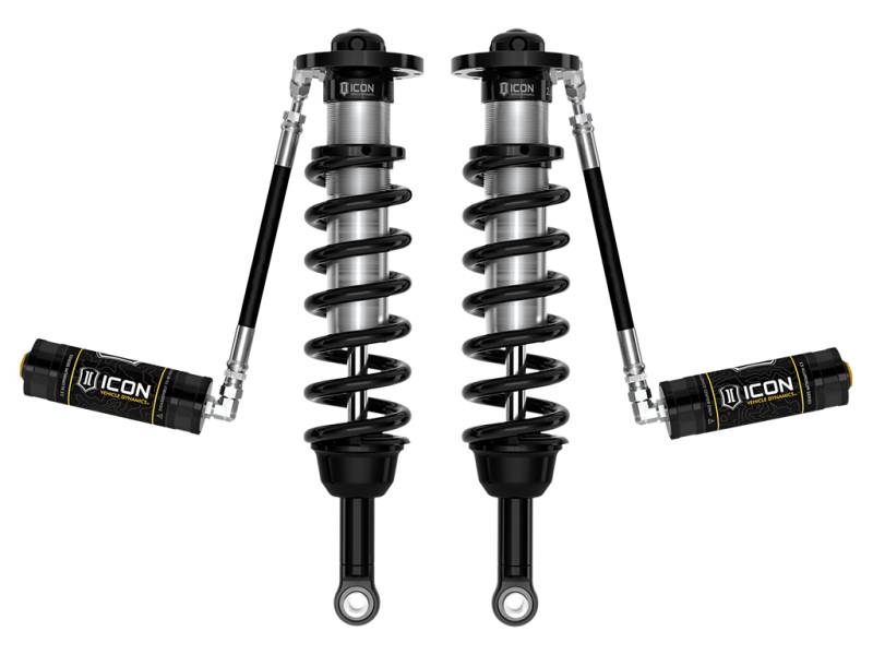 24-25 TACOMA 2.5 VS RR COILOVER KIT ICON Vehicle Dynamics V.S. 2.5 Series remote reservoir front coilover shocks are an incredible upgrade for the front end of the 2024-2025 Toyota Tacoma. These adjustable coilovers allow up 1.25-3” of lift height adjustability, allowing the use of larger, more aggressive wheel and tire combinations. ICON’s Vehicle-specific shock length and valving, their large 2.5” shock body with increased piston surface area over stock components, and their pairing with an ICON front differential drop (4WD only), yield the maximum travel possible along with superior ride quality and suspension performance both on- and off-road. Remote reservoirs greatly increase shock oil volume and heat dissipation surface area to resist overheating and cavitation under hard use, which can lead to damper fade. When paired with ICON 2.0 or 2.5 Aluminum Series rear shock absorbers vehicle control will be balanced front to rear, resulting in the best overall driving experience for your Toyota Tacoma. Vehicle specific tuned for superior shock damping, vehicle control, and improved ride quality over stock Vehicle specific shock length and pairing with front differential drop yields maximum wheel travel Height-adjustable coilovers offer 1.25-3" of lift height adjustment over stock 2.5" diameter shock bodies with remote reservoirs Remote reservoirs maintain cooler operating temperatures during extended off-road use