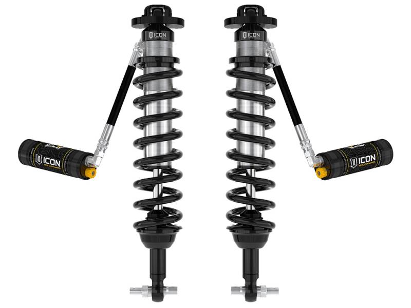 ICON Vehicle Dynamics V.S. 2.5 Series remote reservoir front coilover shocks with CDCV are an incredible upgrade for the front end of the 2021-2026 Ford Bronco. These adjustable coilovers allow up to 3-4” of lift height adjustability on Broncos without the Sasquatch package or 2-3” of lift over stock Sasquatch equipped Broncos, allowing the use of larger, more aggressive wheel and tire combinations. ICON’s Vehicle-specific shock length and valving along with the larger 2.5” shock body and increased piston area over stock components yield the maximum travel possible along with superior ride quality and suspension performance both on- and off-road. Reservoirs greatly increase shock oil volume and heat dissipation surface area to resist overheating and cavitation under hard use, which can lead to damper fade. ICON's exclusive Compression Damping Control Valves are included for precisely dialing in your suspension performance. CDCV controls fluid flow under compression, allowing you to achieve the perfect tune whether driving on the street, slow-crawling through the rocks or mobbing across the desert at full throttle. When paired with ICON 2.5 Series rear coilovers vehicle control will be balanced front to rear, resulting in the best overall driving experience for your Ford Bronco.