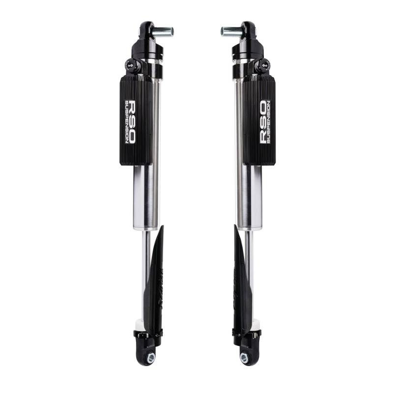 RSO Front 2.5 Adjustable Compression Piggyback Reservoir Shocks 3-5in Lift RSO Suspension Adjustable Shocks with Piggyback Reservoir provide improved suspension damping while increasing on and offroad driving comfort. They feature hand adjustable compression levels to dial in and fine tune suspension feel. These 2.5in smooth bore machined alloy bodies give maximum corrosion resistance. The 3/4in steel shafts and heat-treated steel spherical bearings offer strength and dependability. Its external reservoir allows for increased oil and nitrogen capacity giving greater heat dissipation, increasing performance, and eliminating shock fade. The piggyback design keeps the reservoir tight to the shock body away from any moving suspension components with no need for cutting or drilling. Experience for yourself the incredible performance and precise control that RSO Suspension’s new adjustable piggyback shocks deliver. Hand adjustable compression levels (soft or firm) for ultimate suspension tuning Increased on and offroad comfort while increasing suspension travel and handling 2.5in steel body with polished 3/4in steel shafts and heat-treated spherical bearings offer strength and durability Piggyback design mounts to the body for tight applications. No drilling or cutting required. Allows for increased oil and nitrogen capacity reducing shock fade. Race-developed high flow piston design, direct replacement for all lift kits Vehicle specific fitment to ensure that the part is right for your vehicle. Backed by a Limited 1 Year Manufacturer warranty