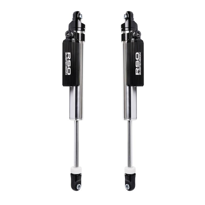 RSO Front 2.5 Adjustable Compression Piggyback Reservoir Shocks 1-3in Lift RSO Suspension Adjustable Shocks with Finned Piggyback Reservoirs provide improved suspension damping while increasing on and offroad driving comfort. They feature hand adjustable compression levels to dial in and fine tune suspension feel. These 2.5in smooth bore machined alloy bodies give maximum corrosion resistance. The 3/4in steel shafts and heat-treated steel spherical bearings offer strength and dependability. Its external reservoir allows for increased oil and nitrogen capacity while the fins on the reservoir increase the surface are giving greater heat dissipation, increasing performance, and eliminating shock fade. The piggyback design keeps the reservoir tight to the shock body away from any moving suspension components with no need for cutting or drilling. Experience for yourself the incredible performance and precise control that RSO Suspension’s new adjustable piggyback shocks deliver. Hand adjustable compression levels (soft or firm) for ultimate suspension tuning Increased on and offroad comfort while increasing suspension travel and handling 2.5in steel body with polished 3/4in steel shafts and heat-treated spherical bearings offer strength and durability Piggyback design mounts to the body for tight applications. No drilling or cutting required. Allows for increased oil and nitrogen capacity reducing shock fade. Race-developed high flow piston design, direct replacement for all lift kits Vehicle specific fitment to ensure that the part is right for your vehicle. Backed by a Limited 1 Year Manufacturer warranty