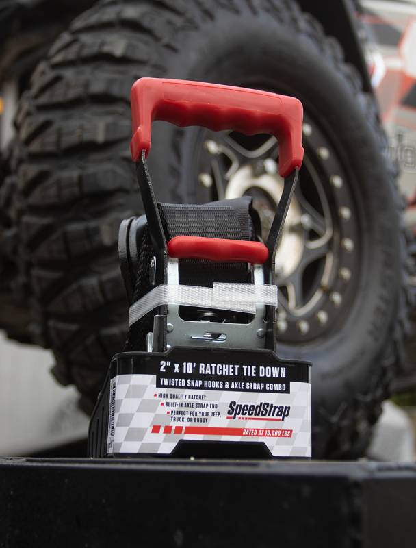 Ratchet 2 in. x 10 ft. Tie Down w/ Twisted Snap Hooks and Axle Strap This heavy duty tie-down is great for securing Trucks, Jeeps, and Buggies. The high quality ratchet mechanism features a wide handle molded grip and cushioned release handle. Large twisted snap hooks on either end keep the strap secure, and wont come undone. The tie-down features a built in Axle-Wrap towith protective sleeve prevent damage to your vehicle. 10,000 lb maximum rated capacity and a 3,333 lb safe working load.