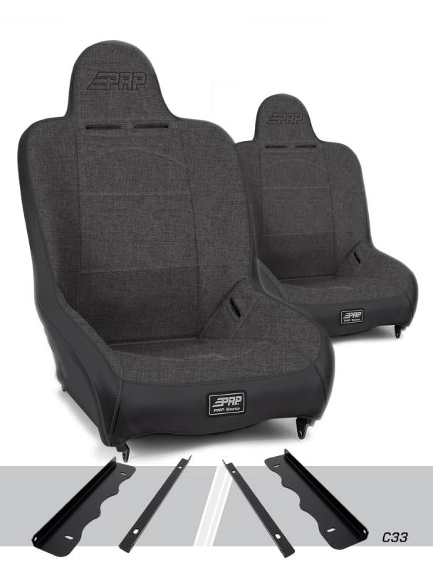 Premier High Back Suspension Seats Kit for 95-01 Jeep Cherokee XJ (Pair) Add more comfort and containment to your Jeep Cherokee XJ (1995-2001) . With 7" of containment, the Premier is PRP's versatile, all-around, off-road suspension seat. A great classic seat for Jeeps, buggies, trail rigs, and prerunners. Medium level containment on the sides keeps you secure when the ride gets rough, but still makes it easy to get in & out of the vehicle. The vinyl-coated nylon suspension liner and dual-density foam decrease the impact on the body, reducing the fatigue you feel after a long day in the dirt or dunes. The seat features Tweed Center, Vinyl Back and Vinyl Piping. This kit comes with 2x Premier Seats, and the adapter mounts to fit into your Jeep Cherokee XJ (1995-2001). The adapter mounts bolt to your OEM sliders, allowing you to install the seat while retaining the ability to slide back and forth. Seat Dimensions: 31? Tall x 21? Wide x 26? Deep Fitment Jeep Cherokee XJ (1995-2001) Note: *Seat height is typically 2" higher than stock seats. Made for Off-Road use only with 4pt or 5pt off-road harnesses. Passenger Seats may not retain the ability to tumble. 3pt Seat Belts will need a Seat Belt Extension/Angle Bracket.