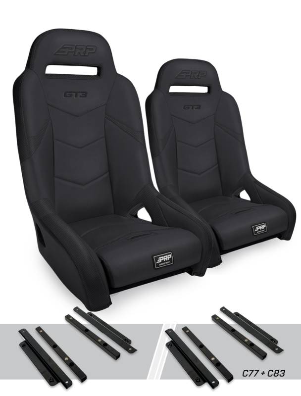 GT3 Suspension Seats Kit for Polaris General, RZR S 900, 900 Trail, Trail, XP 10 Add more comfort and containment to your Polaris General or RZR with PRP's next generation of our most popular suspension seat! The GT3 is the third generation of our best selling GT Series. New features include a removable seat cushion, a 5th point harness slot, and all new modern styling. The GT3 keeps you contained and comfortable with 7? of containment, and plenty of foam to soak up the bumps. Medium level containment on the sides keeps you secure when the ride gets rough, but still makes it easy to get in & out of the vehicle. The vinyl-coated nylon suspension liner and dual-density foam decrease the impact on the body, reducing the fatigue you feel after a long day in the dirt or dunes. Constructed from durable and water resistant vinyl, so it's easy to clean after a weekend of getting dirty and dusty. Improve your ride! Upgrade to the most innovative aftermarket RZR suspension seat! This kit comes with 2x GT3. Seats, and the adapter mounts to fit into the front Polaris General or RZR. The adapter mounts attach to your OEM seat base and sliders. This allows you to install the seat while retaining the ability to slide back and forth, as well as release and remove the seat when you need to access the battery. FITMENT: 2015+ Polaris General, General 4 (Front or Rear). 2015+ RZR Trail (Front) 2015-2023 RZR S 900, RZR S4 900 (Front), 900 Trail, XP 1000, XP4 1000 (Front), XP Turbo, XP4 Turbo (Front), XP Turbo S, XP4 Turbo S (Front)