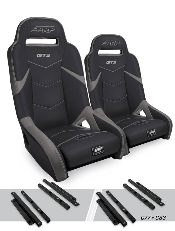 GT3 Suspension Seats Kit for Polaris General, RZR S 900, 900 Trail, Trail, XP 10 Add more comfort and containment to your Polaris General or RZR with PRP's next generation of our most popular suspension seat! The GT3 is the third generation of our best selling GT Series. New features include a removable seat cushion, a 5th point harness slot, and all new modern styling. The GT3 keeps you contained and comfortable with 7? of containment, and plenty of foam to soak up the bumps. Medium level containment on the sides keeps you secure when the ride gets rough, but still makes it easy to get in & out of the vehicle. The vinyl-coated nylon suspension liner and dual-density foam decrease the impact on the body, reducing the fatigue you feel after a long day in the dirt or dunes. Constructed from durable and water resistant vinyl, so it's easy to clean after a weekend of getting dirty and dusty. Improve your ride! Upgrade to the most innovative aftermarket RZR suspension seat! This kit comes with 2x GT3. Seats, and the adapter mounts to fit into the front Polaris General or RZR. The adapter mounts attach to your OEM seat base and sliders. This allows you to install the seat while retaining the ability to slide back and forth, as well as release and remove the seat when you need to access the battery. FITMENT: 2015+ Polaris General, General 4 (Front or Rear). 2015+ RZR Trail (Front) 2015-2023 RZR S 900, RZR S4 900 (Front), 900 Trail, XP 1000, XP4 1000 (Front), XP Turbo, XP4 Turbo (Front), XP Turbo S, XP4 Turbo S (Front)