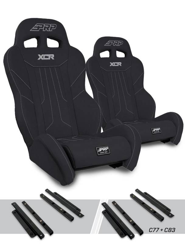 XCR Suspension Seats Kit for Polaris General, RZR S 900, 900 Trail, Trail, XP 10 Add more comfort and containment to your Polaris General or RZR with the latest UTV Seat from PRP! The XCR Suspension Seat new features include a removable seat cushion, a 5th point harness slot, and all new modern styling. The XCR features side bolsters towards the front that gives you some containment for when the ride gets rough. But the seat has open bolsters at the hips, which allow you to use OEM 3-point seat belts, and make it easy to use with retractable harnesses. These low sides make it much easier to get in and out of the vehicle and to get lap belts tightened. The vinyl-coated nylon suspension liner and dual-density foam decrease the impact on the body, reducing the fatigue you feel after a long day in the dirt or dunes. The removeable seat cushion give you lots of comfort on long rides, allows mud, sand, and water to drain out the bottom of the seat, and includes a 5th point slot for harnesses. Overall this seat is great for trail riding, or when you’re constantly getting in and out on rides. Constructed from durable and water resistant vinyl, so it’s easy to clean after a weekend of getting dirty and dusty. This kit comes with 2x XCR. Seats, and the adapter mounts to fit into the front Polaris General or RZR. The adapter mounts attach to your OEM seat base and sliders. This allows you to install the seat while retaining the ability to slide back and forth, as well as release and remove the seat when you need to access the battery. FITMENT: 2015+ Polaris General, General 4 (Front or Rear). 2015+ RZR Trail (Front) 2015-2023 RZR S 900, RZR S4 900 (Front), 900 Trail, XP 1000, XP4 1000 (Front), XP Turbo, XP4 Turbo (Front), XP Turbo S, XP4 Turbo S (Front)