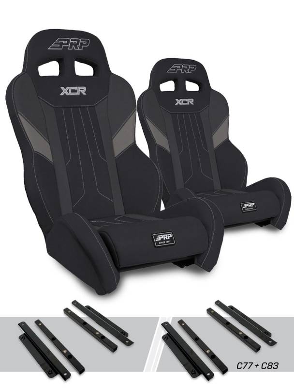 XCR Suspension Seats Kit for Polaris General, RZR S 900, 900 Trail, Trail, XP 10 Add more comfort and containment to your Polaris General or RZR with the latest UTV Seat from PRP! The XCR Suspension Seat new features include a removable seat cushion, a 5th point harness slot, and all new modern styling. The XCR features side bolsters towards the front that gives you some containment for when the ride gets rough. But the seat has open bolsters at the hips, which allow you to use OEM 3-point seat belts, and make it easy to use with retractable harnesses. These low sides make it much easier to get in and out of the vehicle and to get lap belts tightened. The vinyl-coated nylon suspension liner and dual-density foam decrease the impact on the body, reducing the fatigue you feel after a long day in the dirt or dunes. The removeable seat cushion give you lots of comfort on long rides, allows mud, sand, and water to drain out the bottom of the seat, and includes a 5th point slot for harnesses. Overall this seat is great for trail riding, or when you’re constantly getting in and out on rides. Constructed from durable and water resistant vinyl, so it’s easy to clean after a weekend of getting dirty and dusty. This kit comes with 2x XCR. Seats, and the adapter mounts to fit into the front Polaris General or RZR. The adapter mounts attach to your OEM seat base and sliders. This allows you to install the seat while retaining the ability to slide back and forth, as well as release and remove the seat when you need to access the battery. FITMENT: 2015+ Polaris General, General 4 (Front or Rear). 2015+ RZR Trail (Front) 2015-2023 RZR S 900, RZR S4 900 (Front), 900 Trail, XP 1000, XP4 1000 (Front), XP Turbo, XP4 Turbo (Front), XP Turbo S, XP4 Turbo S (Front)