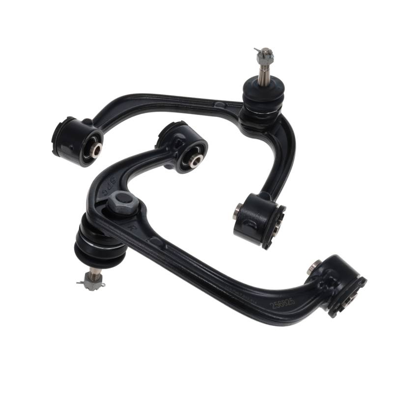 FORD F150 ADJ UPPER ARMS Ideal for both OE ride height and lifted trucks, SPC's adjustable upper front control arms Improve droop travel, drivability and tire wear as well as adjusting tire position in your wheel well. Now equipped with maintenance free ball joints and rubber isolated xAxis(TM) bushings, this arm is designed to correct alignment angles while maintaining factory ride quality. SPC's fully forged steel design provides the strength and durability needed for the most demanding environments. These remove and replace arms are sold in pairs. Get more droop travel: SPC's arm has improved clearance to get around the spring bucket. With 80 of articulation in the upgraded ball joint and free pivoting cross axis bushings, SPC's arm gives you maximum droop travel. Get your drivability and tracking back: When you lift your truck you affect caster and camber. SPC's arms have +1 of caster built into them. Using its patented ball joint design the arm will get you 2 of caster and 2 of camber, so you can put your alignment angles back to specification. Improve tire clearance: Use adjustment in the SPC arm and on the OE lower arm to maximize alignment angles and move oversized tires forward in the wheel well to minimize or avoid fender trimming. Do you need replacement cams for the lower control arm? Check out SPC p/n 86250, adjustable cam nut/bracket or 86252, HD cam bolt assemblies. SPC Adjustable Front Upper Control Arms are the industry standard in off-road and racing applications Patented design for extra camber and caster adjustment SPC ball joints are oversized and provide 80 of travel