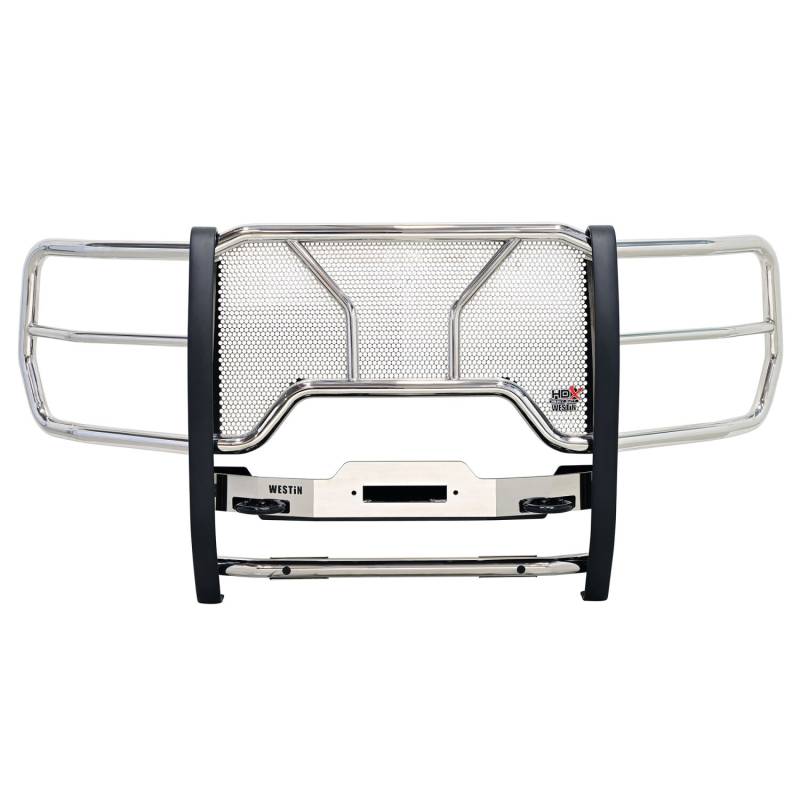 HDX Winch Mount Grille Guard Westin's HDX Winch Mount Grille Guard is extreme truck gear for the enthusiast that seeks additional functionality for their truck. It encompasses all of the features of an HDX Grille Guard with the additional capability to hold a winch up to 10.25 inches tall with a rating of up to 12,000 lbs. Winch trays are tested and capability confirmed to a minimum straight line pull of 16,500 lbs. HDX Winch Mount Grille Guards are available in 304 stainless steel backed by a lifetime warranty and black powder coat steel backed by a 3 year warranty. Mount kit and hardware included 1-piece with welded headlight guards 2" tube full wrap-around wings Full punch plate grille Tray brackets mount directly to the vehicle frame