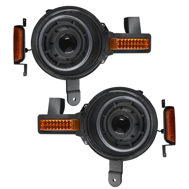 Oculus(TM) Bi-LED Projector Headlights for 2021+ Ford Bronco - Amber LED Introducing the all-new Oculus Bi-LED Headlamp system for the 2021+ FORD Bronco by ORACLE Lighting. Featuring a unique modular design, easy plug-and-play installation, and advanced LED projection with 5,200 Lumens of high-quality illumination for enhanced driver visibility in all weather conditions. The Oculus headlight is compatible with both the standard and signature Bronco lighting models. Precision LED lighting projector for optimum light distribution and beam angle. Installs using original mounting hardware and headlight wiring is Plug & Play into the factory connector without additional relays or harnesses. Halo is available in White or Amber LED and features over 200 bright LEDs for a vivid lighting impact. These all-new headlamps provide enhanced driver visibility with increased and focused LED light output. This complete headlight replacement features a high-precision sharp cut-off line which reduces glare and prevents blinding oncoming traffic even when installed on lifted Broncos. Package includes tool for easy beam angle adjustability. The new modular design allows separate components (turn signal, marker lights, and mounting tabs) to be installed independently. This modular design provides smaller packaging size for lower shipping costs for the end user and prevents possible damage from shipping on these components. The modular design also allows for these individual components to be replaced or upgraded down the road when future options are available. It is undeniably important to implement proper thermal management tools for high-performance LEDs to operate with reliability in various environments. Oculus utilizes both active and passive cooling methods to sustain low LED temperatures. Remote mounted heat sinks and an internal cooling fan work in conjunction to insure proper temperature control and longevity of the LEDs. Warranty: 2 Years