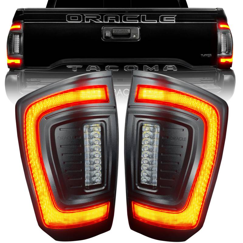 Flush Style LED Tail Lights for 2016-2023 Gen 3 Toyota Tacoma Protruding out significantly less than the factory tail lights, this low-profile design has a more streamlined appearance while also reducing the risk of tail light damage. These flush tail lights feature a unique modular design and functional LED lighting elements including high-powered reverse lights, unique signature perimeter lighting, and an animated turn signal sequence. No more problems backing up at night and no longer do you need to install additional reversing lamps onto the back of your truck to get the brightness you desire. That's because these LED reverse lights are basically a pair of LED light bars mounted into the tail light which will provide over 4,400 Lumens of rear-facing illumination! In addition to the attractive ?signature style LED lighting band and the high-output reverse light this design also features a ?dynamic turn signal effect. This ?motion or ?sequential effect is a fluid LED motion from the inside portion of the light to the outside portion of the light signifying the direction of the turn signal with a fluid animated LED sequence. The adapters provide a true plug-and-play option without any other wiring being needed for installation. The new modular design allows the light to be quickly disassembled for custom painting. The Reverse Light module and Stop/Tail/Turn module can be easily removed from the black housing which can then be painted to match the body color of the vehicle to provide a more customized appearance that more seamlessly blends with the truck. These innovative LED tail lights were designed and engineered by ORACLE Lighting right here in the USA. This Patent-Pending tail light design provides many unique features and characteristics, providing an aesthetically pleasing product with a forward-thinking design language. 2 Year Warranty
