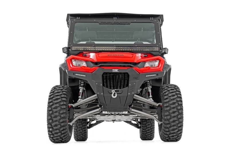 Upgrade Style and Performance: Transform the front of your Honda Pioneer 1000-6 with Rough Country's Front Bumper Panels featuring 6-Inch LED Lights. These rugged steel panels bolt directly onto your factory bumper, giving your UTV an aggressive, modern look while adding powerful front-end illumination.High-Intensity Off-Road Lighting: Each panel houses a 6-inch Rough Country Slimline LED Lightbar delivering 4,800 lumens of bright, reliable light. With a wide 90-degree flood beam and IP67 waterproof housing, these LEDs are engineered to conquer tough terrain and all weather conditions, keeping your trail visible no matter the hour.Durable Construction: Crafted from heavy-duty 11-gauge powder-coated steel and die-cast aluminum housings, these panels are built to withstand the rigors of off-road adventures. Moisture-Breather technology reduces condensation behind the lens, ensuring your lights stay clear and bright.Simple, Yet Customized Installation: A few minor modifications to your factory bumper are required for a perfect fit, making installation straightforward while giving your Pioneer a seamless, upgraded look. Includes a premium flat-wound wiring harness with on/off switch for plug-and-play convenience.Reliable Warranty: Backed by a 3-year Rough Country warranty, these bumper panels are designed to deliver long-lasting performance and peace of mind for every off-road excursion.
