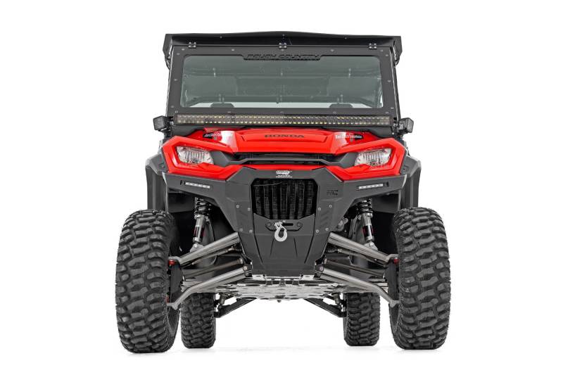 Enhance the look and capabilities of your Honda Pioneer's front bumper with Rough Country's Front Bumper Panels with 6-Inch LED Lights. This innovative add-on installs directly on to the factory bumper giving your UTV a more menacing appearance and additional front-end illumination. These durable 11-gauge steel panels offer a sleek, modern look that extends to the edge of the front end assembly.\ Each panel holds a 6-inch Rough Country Slimline LED Lightbar providing 2.880 lumens of off-road lighting so you can always see the trail ahead. Encased in an IP67 waterproof housing, Rough Country's LED lights are engineered to tackle tough terrain and wit'stand the elements.\ With a few simple modifications to the factory bumper, this easy-to-install shroud system makes for an excellent upgrade to your Honda Pioneer's front bumper!