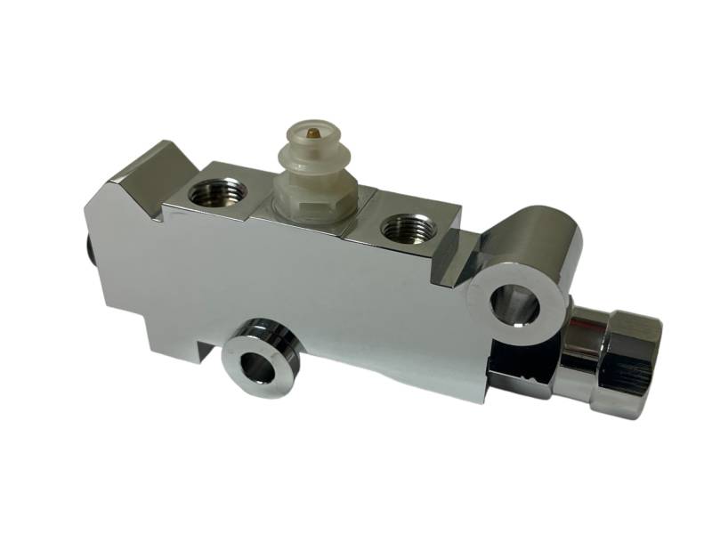 Proportioning Valve - Disc/Drum Chrome Add safety to your brake system with this front disc/ rear drum chrome proportioning valve. When upgrading to a dual bowl master cylinder is it always wise to add a proportioning valve equipped with a safety switch. The safety switch built into this brake line valve senses when your brake system is producing unequal or lower pressure to one or more of the wheels, usually caused by a component failure. When the valve senses this drop or change in pressure it will cut off the pressure to the port supplying fluid to the defective brakes, thus stopping the leak. At this point you have noticed a change in your pedal feel, your brakes stopping ability and possibly the warning light on your dashboard. You will now be able to safely pull the vehicle off the road without causing harm to you or your vehicle. Without this valve installed if a component fails on your vehicle your brake pedal will drop to the floor as you pump the pedal with little to no braking. Brakes are the most important component on your vehicle, do it right the first time, be safe. Manufactured to OE specifications