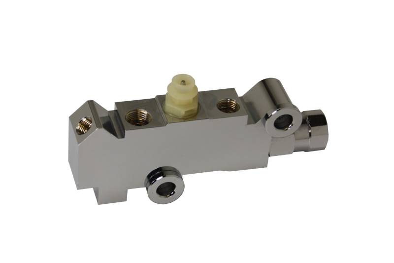 Proportioning Valve - Disc/Disc Chrome Add safety to your brake system with this 4 wheel disc brake chrome proportioning valve. When upgrading to a dual bowl master cylinder is it always wise to add a universal proportioning valve equipped with a safety switch. The safety switch built into this valve senses when your brake system is producing unequal or lower pressure to one or more of the wheels, usually caused by a component failure. When the valve senses this drop or change in pressure it will cut off the pressure to the port supplying fluid to the defective brakes, thus stopping the leak. At this point you have noticed a change in your pedal feel, your brakes stopping ability and possibly the warning light on your dashboard. You will now be able to safely pull the vehicle off the road without causing harm to you or your vehicle. Without this 4 wheel disc brake proportioning valve installed if a component fails on your vehicle your brake pedal will drop to the floor as you pump the pedal with little to no braking. Brakes are the most important component on your vehicle, do it right the first time, be safe. Manufactured to OE specifications