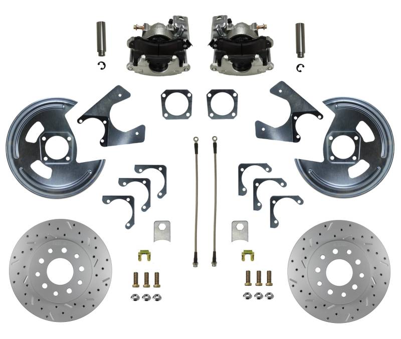 Rear Disc Brake Kit with Drilled Rotors and Zinc Plated Calipers Add the safety, reliability and performance of rear disc brakes to your vehicle with our drum to 10 bolt disc brake conversion. In this GM rear disc brake conversion kit, you receive everything you need to mount single piston disc brakes to your GM 10 & 12 Bolt Rear Axle. All components used in these GM rear disc brake conversion kits are new high quality, precision machined products with a zinc plated finish to reduce corrosion and extend the life of your brake system. The heavy duty parking brake caliper will allow you to use your stock parking brake cables to actuate your parking brake. Includes single piston calipers with built in parking brake Includes 11-1/8" rotors