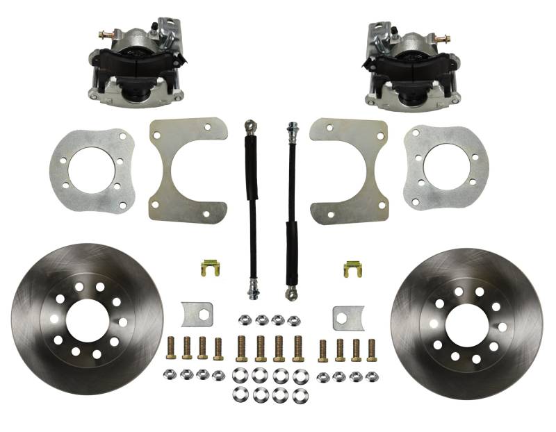 Rear Disc Brake Kit with Plain Rotors and Zinc Plated Calipers Add the safety, reliability and performance of rear disc brakes to your vehicle with our drum to disc brake conversion. In this kit you receive everything you need to mount single piston disc brakes to your Mopar 8-1/4, 9-1/4 Rear Axles. All components used in these Mopar rear disc brake conversion kits are new high quality, precision machined products with a zinc plated finish to reduce corrosion and extend the life of your brake system. The heavy duty parking brake caliper will allow you to use most stock parking brake cables to actuate your parking brake. Includes single piston calipers with built in parking brake Includes 11-1/8" rotors
