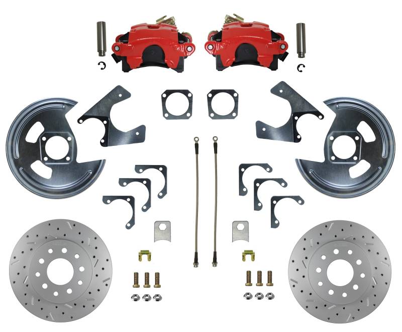Rear Disc Brake Kit with Drilled Rotors and Red Powder Coated Calipers Add the safety, reliability and performance of rear disc brakes to your vehicle with our drum to 10 bolt disc brake conversion. In this GM rear disc brake conversion kit, you receive everything you need to mount red powder coated single piston disc brakes to your GM 10 & 12 Bolt Rear Axle. All components used in these GM rear disc brake conversion kits are new high quality, precision machined products with a zinc plated finish to reduce corrosion and extend the life of your brake system. The heavy duty parking brake caliper will allow you to use your stock parking brake cables to actuate your parking brake. Includes single piston calipers with built in parking brake Includes 11-1/8" rotors